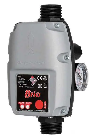 Brio 2000 NEW (press control)elektronikus áramlásszabályzó, áramláskapcsoló készülék, szárazon futtás elleni védelemmel és szárazonfutás esetén automatikusan a Reset gomb megnyomása nélkül többször megpróbálja elindítani a szivattyút. A Brio 2000 NEW áramláskapcsoló azzal a céllal lett kidolgozva, hogy automatizálják az elektromos szivattyúk indítását és leállítását. Nyomásesés és az áramlás leállása esetén a golyóscsap kinyitásakor és elzárásakor a Brio 2000 NEW áramláskapcsoló elektronikusan vezérli az indítási és leállási funkciókat a szivattyún. A száraz futás által okozott sérülések a Brio 2000 NEW áramláskapcsoló alkalmazásával elkerülhetők, mivel ez a kapcsoló víz hiánya esetén leállítja a szivattyút. A Brio 2000 NEW (press control) áramláskapcsoló kiemelkedik kompakt méreteivel és könnyű szerelhetőségével, könnyen és biztonságosan felerősíthető. Az elektromos csatlakozások praktikusan vannak elhelyezve és könnyen hozzáférhetők. Egyszerűen csak követni kell az áramláskapcsoló csatlakozásának a műanyag burkolatra nyomtatott huzalozási jelzéseit. A Brio 2000 NEW áramláskapcsoló kifejlesztésére és gyártása során nagy gondot fordítottak az alapanyagok kiválasztására annak érdekében, hogy elsőosztályú terméket kínáljunk.